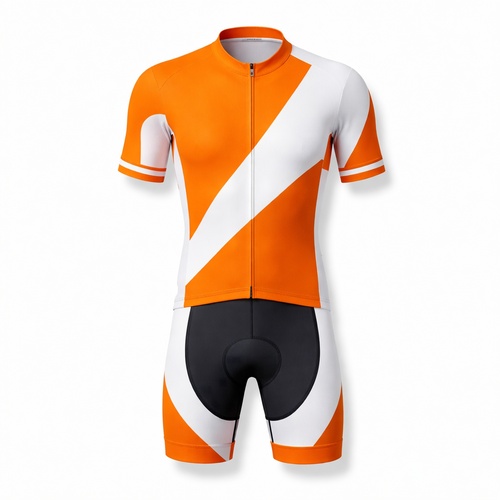 This cycling skinsuit features a bright orange base with a bold white diagonal sash across the chest and matching white accents on the sleeves. It is paired with black shorts that have curved white and orange side panels.